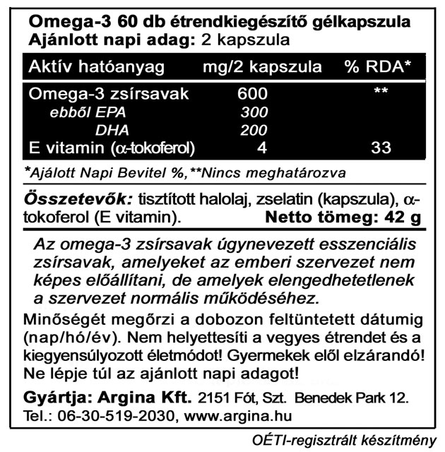 Az Omega-3 600 kapszula EPA és DHA tartalma 250 mg, így már napi egy kapszula bevitele hozzájárul a normális vérnyomás és a vér normális triglicerid szintjének fenntartásához. Anyák esetében napi 2 kapszula bevitele hozzájárul a magzat és az anyatejjel táplált gyermek agyának és szemének normális fejlődéséhez!