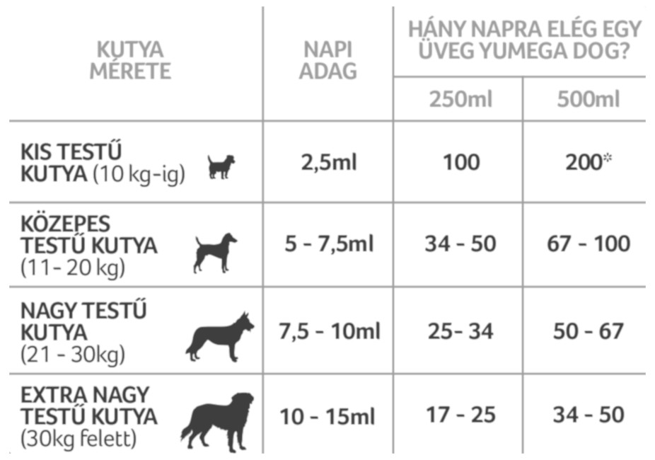 Keverje össze a lent megadott mennyiséget az étellel a rendelkezésre álló mérő eszközzel. Ne lépje túl a napi ajánlott adagot. Nagyon fontos, hogy a kutya időt kapjon arra, hogy megszokja az újdonságot az ételeben ezért próbálja meg csak a felét adni az első héten az ajánlott adagnak mielőtt odaadja a teljeset.
