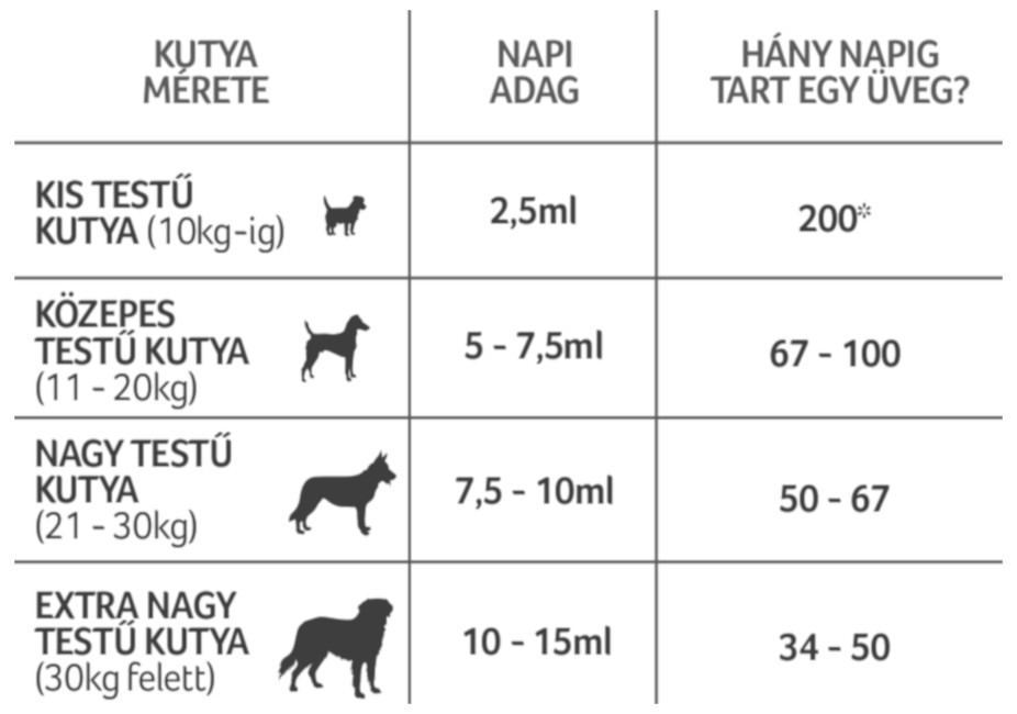 Keverje össze a lent megadott mennyiséget az étellel a rendelkezésre álló mérő eszközzel. Ne lépje túl a napi ajánlott adagot. Nagyon fontos, hogy a kutya időt kapjon arra, hogy megszokja az újdonságot az ételeben ezért próbálja meg csak a felét adni az első héten az ajánlott adagnak mielőtt odaadja a teljeset.